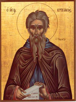 Свети Киријак рођен је у Коринту, а још у младости се потпуно посветио Богу и вери. Свети Јефтимије га је запазио, прозревши у њему будућег великог духовника, и узео га под своје окриље.