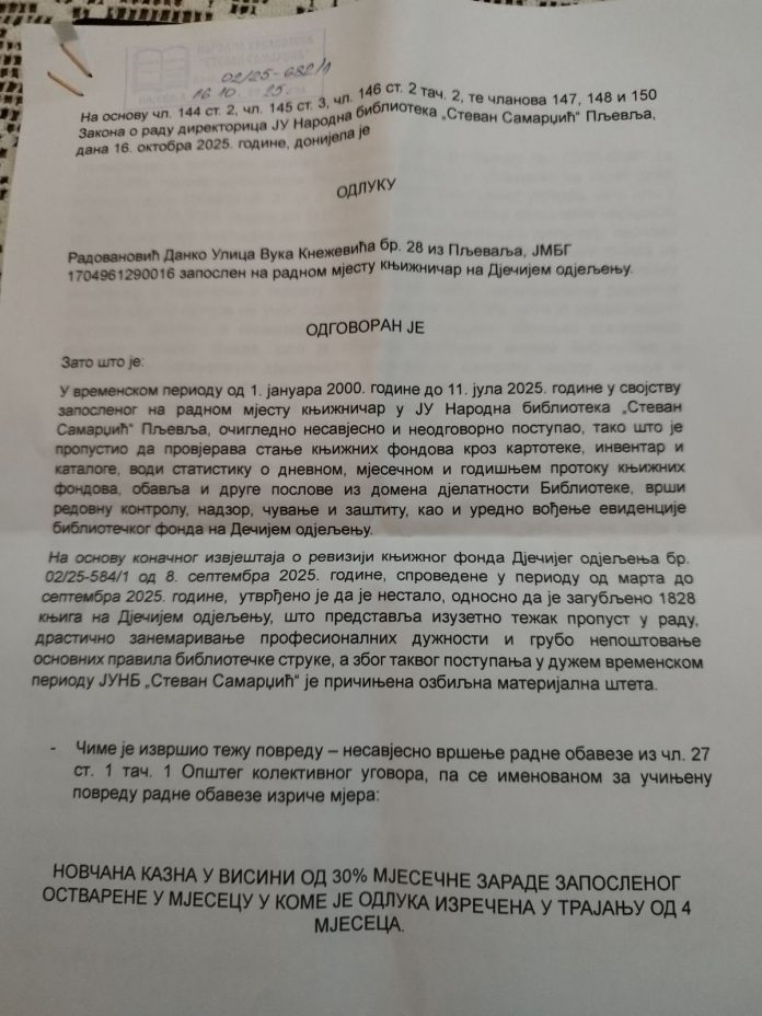 Запослени у Народној библиотеци „Стеван Самарџић“ Данко Радовановић кажњен је новчаном казном због нестанка књига са дјечијег одјељења у периоду од почетка 2000. до септембра 2025. године.