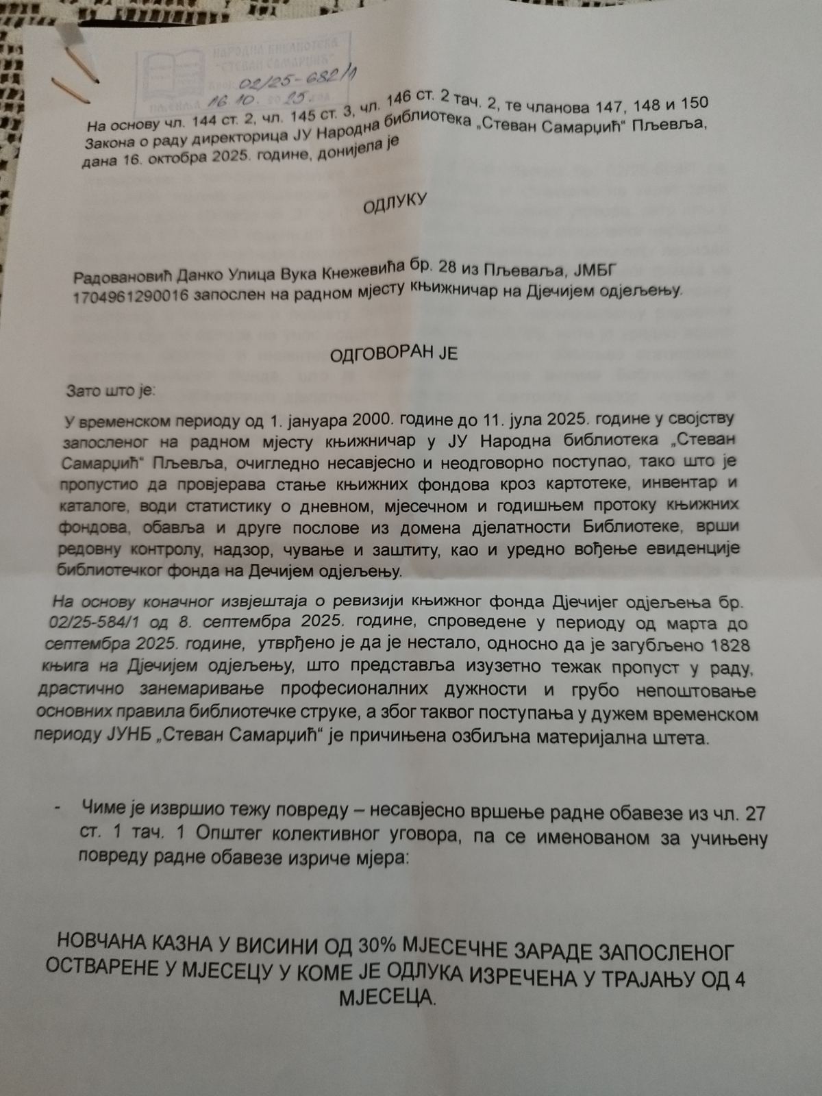 Према рјешењу које је потписала директорка библиотеке Бојана Ђачић, Радовановићу је изречена мјера умањења плате за 30 одсто у наредна четири мјесеца. У документу, међутим, нема података о одговорности других радника који су током протеклих 25 година радили на дјечијем одјељењу, нити доказа да је искључиво Радовановић одговоран за нестанак књига.