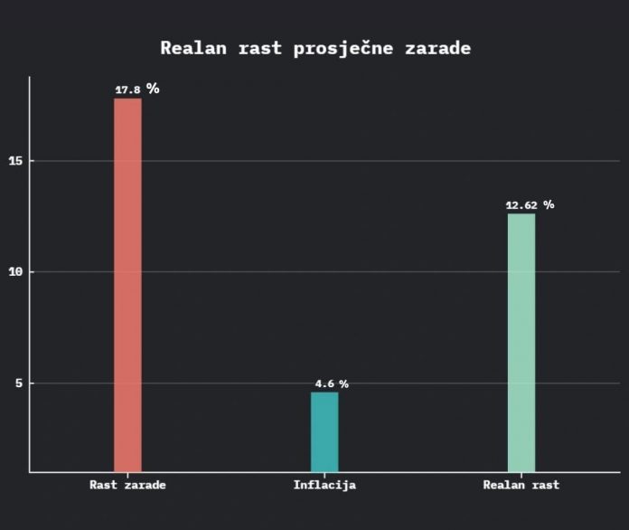 Просјечна плата у Црној Гори за годину дана порасла је 17,8 %, уз инфлацију од 4,6 %, што значи да је реални раст зарада износио 12,68 %, саопштено је из Монстата.