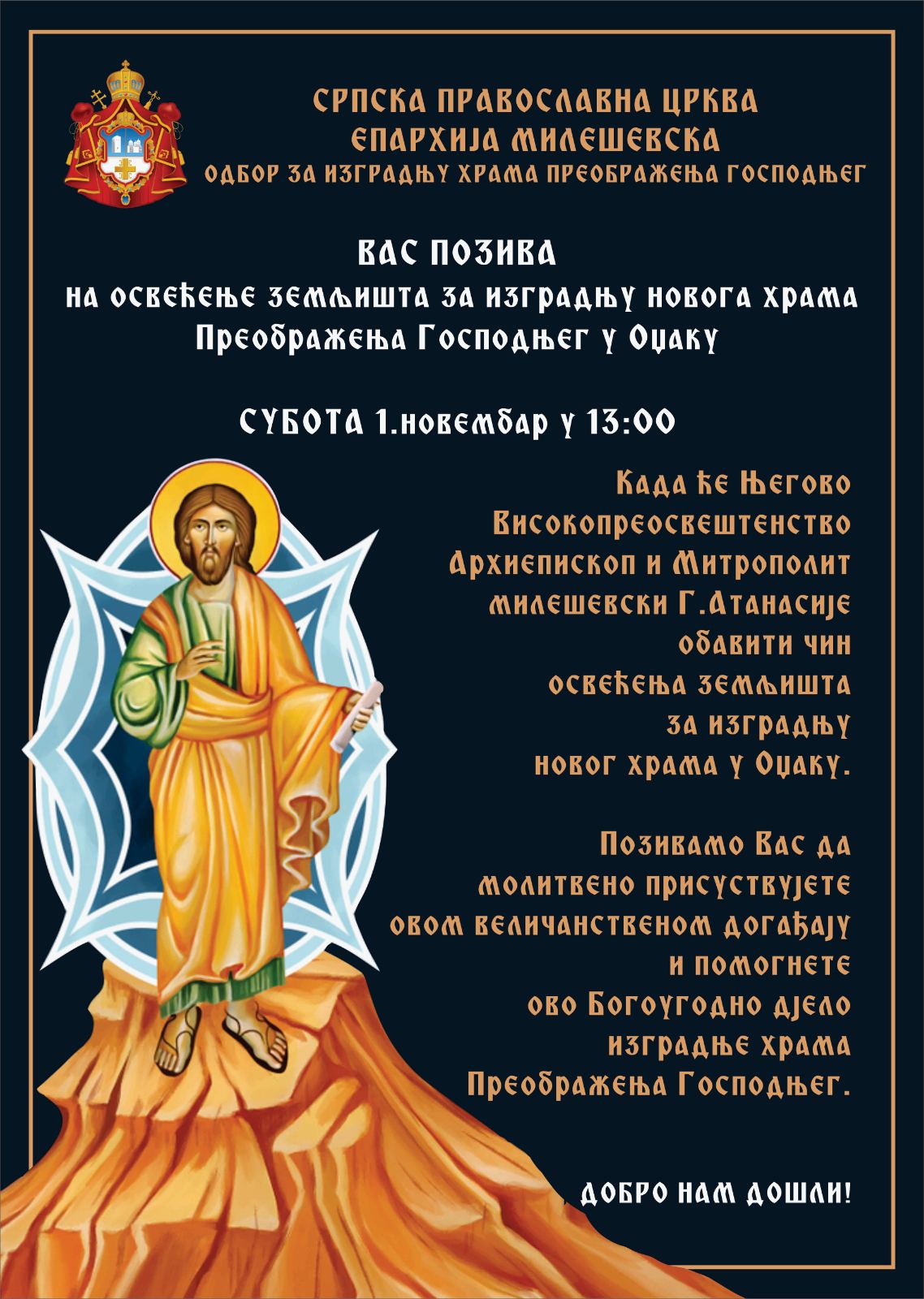 Његово високопреосвештенство митрополит милешевски Атанасије, уз саслужење свештенства и монаштва Српске православне цркве, освештаће 1. новембра земљиште у Оџаку, гдје ће бити подигнута црква Преображења Господњег. Према званичном саопштењу, чин освећења ће се обавити у 13 часова.