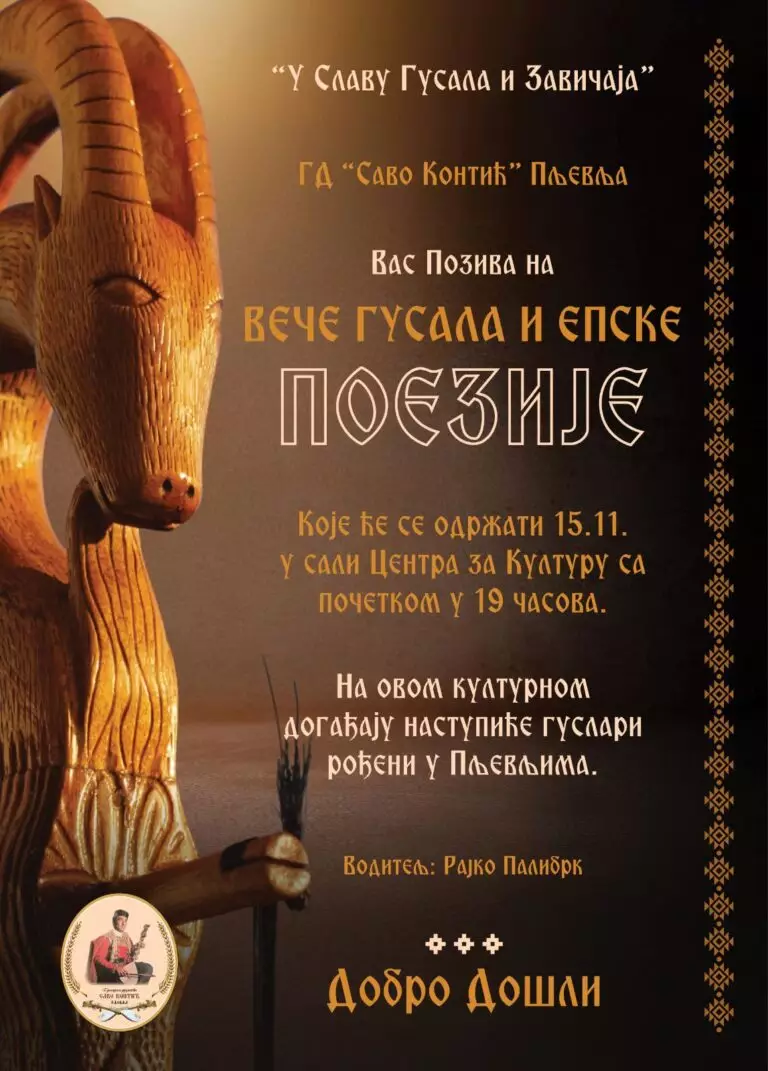 У организацији Гусларског друштва „Саво Контић“, у петак, 15. новембра, у Центру за културу, са почетком у 19 часова, одржаће се Вече гусала и епске поезије.