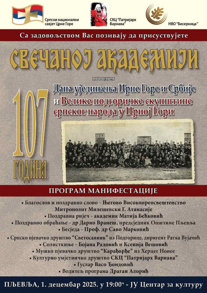 Српски национални савјет Црне Горе, СКЦ „Патријарх Варнава“ и НВО „Бисерница као и претходних година поводом 107. годишњице од Велике подгоричке скупштине српског народа у Црној Гори и Дана уједињења Црне Горе и Србије организују Свечану академију 1. децембра 2025. године у ЈУ Центар за културу у Пљевљима са почетком у 19:00 часова.