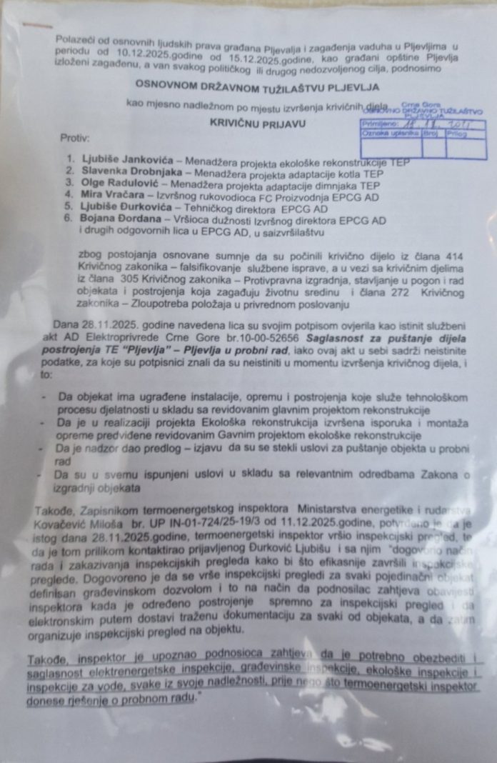 Пљевљаци Ненад Рубежић, дипломирани инжењер грађевине, и Саша Јечменица, дипломирани правник и независни одборник у Скупштини општине Пљевља, поднијели су кривичне пријаве против шест особа и других одговорних лица која су недавно одобрила пробни рад Термоелектране Пљевља. Пријаве су поднијете против Љубише Јанковића, Славенка Дробњака, Олге Радуловић, Мира Врачара, Љубише Ђурковића и Бојана Ђордана.
