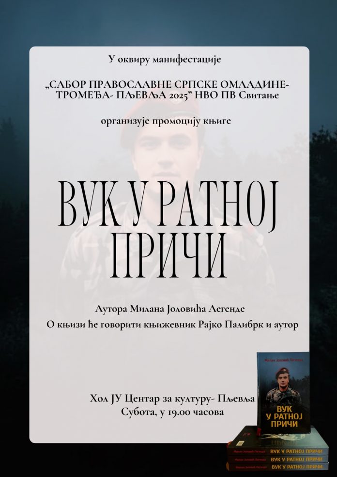 У оквиру манифестације „Сабор православне српске омладине Тромеђа–Пљевља 2025“, 27. децембра, у холу Центра за културу, са почетком у 19 часова, одржаће се промоција књиге „Вук у ратној причи“, аутора Милана Јоловића Легенде. Поред аутора, публици ће се обратити и књижевник Рајко Палибрк.