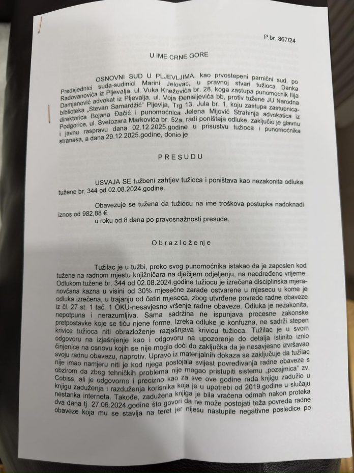 Уколико Виши суд у Бијелом Пољу потврди пресуду Основног суда у Пљевљима, Народна библиотека „Стеван Самарџић“ мораће запосленом раднику Данку Радовановићу исплатити 982 евра, јер га је директорица ове установе Бојана Ђачић неосновано казнила.