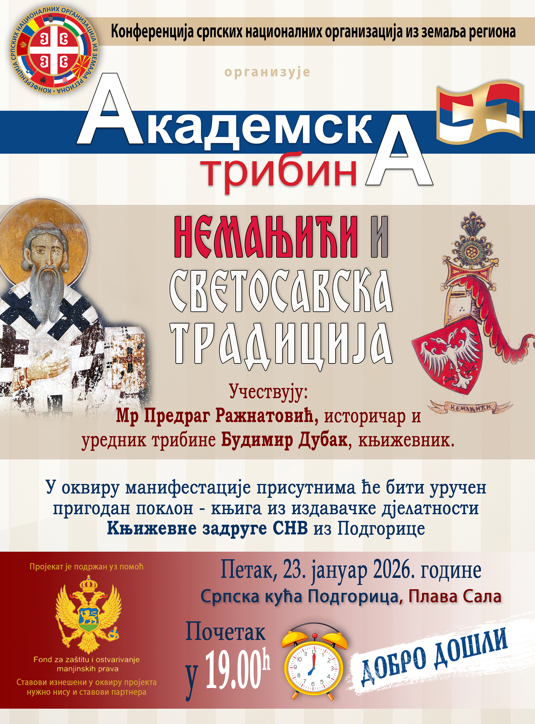 Конференција српских националних организација из земаља региона организује академску трибину под називом „Немањићи и светосавска традиција“.