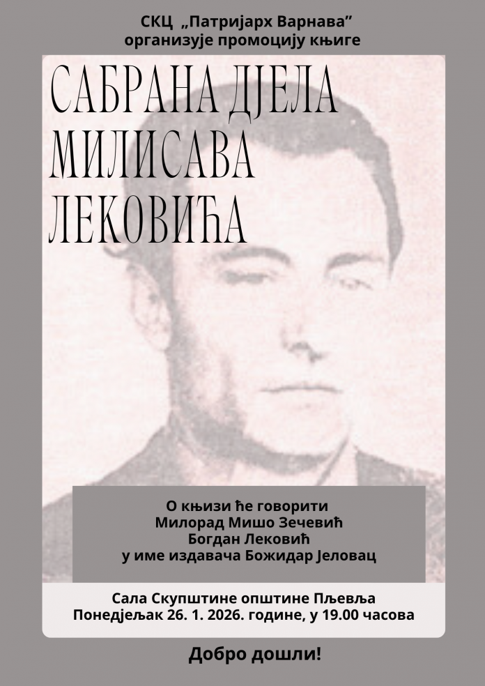 СКЦ „Патријарх Варнава“ организује промоцију књиге „Сабрана дјела Милисава Лековића“, која ће бити одржана у понедјељак, 26. јануара 2026. године, са почетком у 19.00 часова, у Сали Скупштине општине Пљевља.