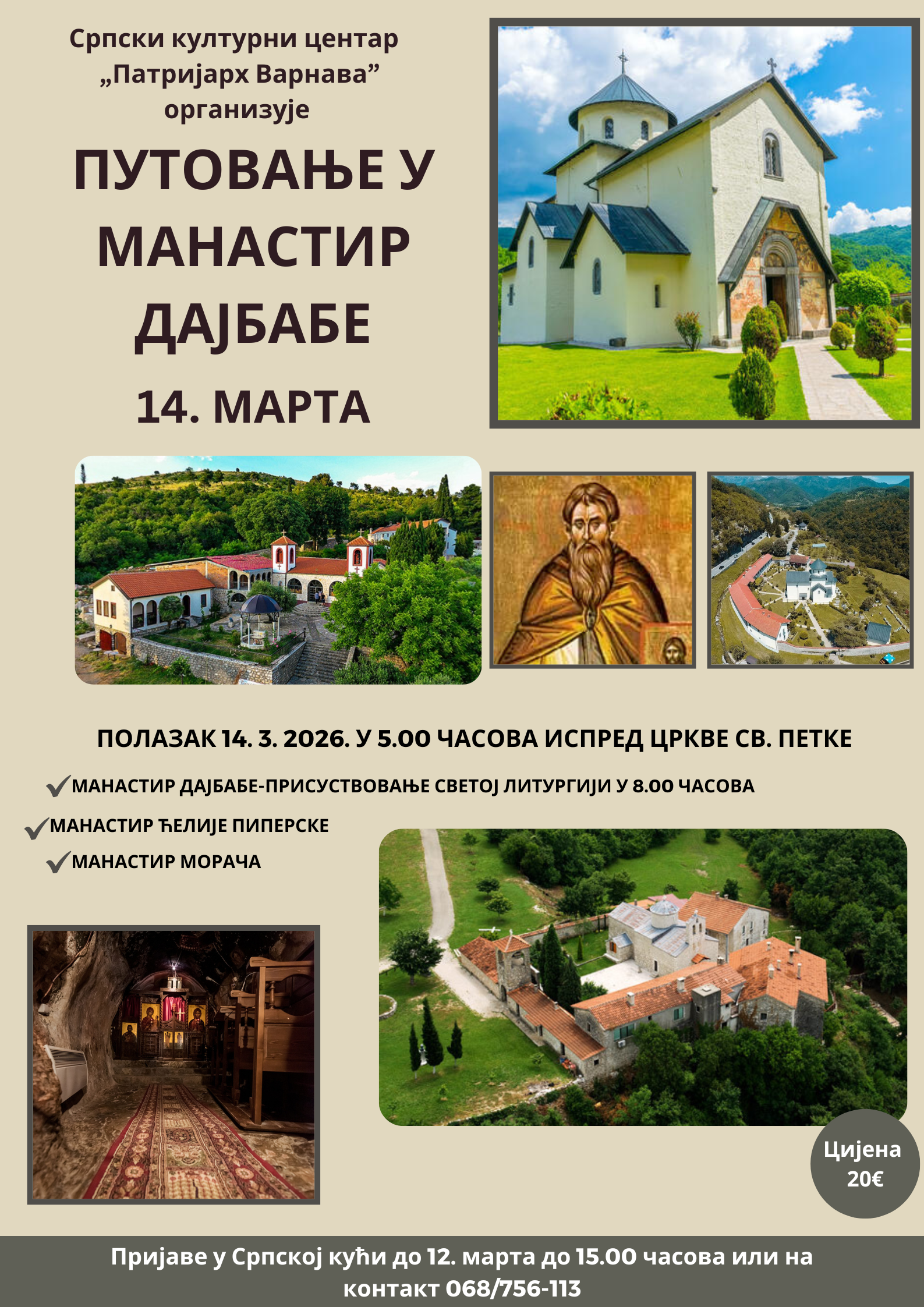 Српски културни центар Патријарх Варнава организује у петак, 14. марта, једнодневну посјету манастирима Манастир Дајбабе, Манастир Ћелије Пиперске и Манастир Морача.