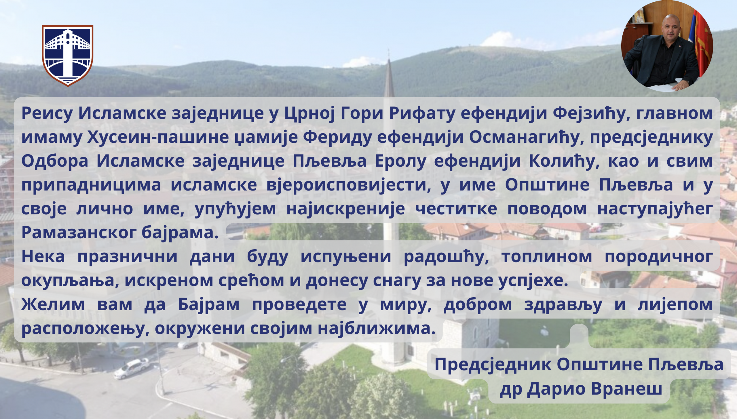 Предсједник Општине Пљевља, Дарио Вранеш, честитао је Рамазански бајрам реису Исламске заједнице у Црној Гори, Рифат ефендија Фејзић, предсједнику Одбора Исламске заједнице Пљевља, Ерол ефендија Колић, као и свим припадницима исламске вјероисповијести.
