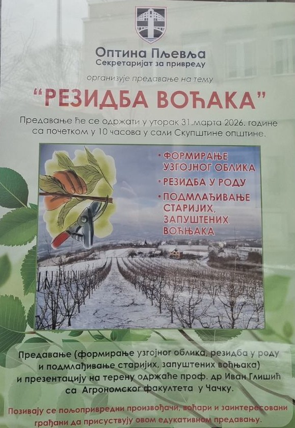 У сали Скупштине општине Пљевља, у уторак, 31. марта, са почетком у 10 часова, одржаће се предавање на тему „Резидба воћака“.