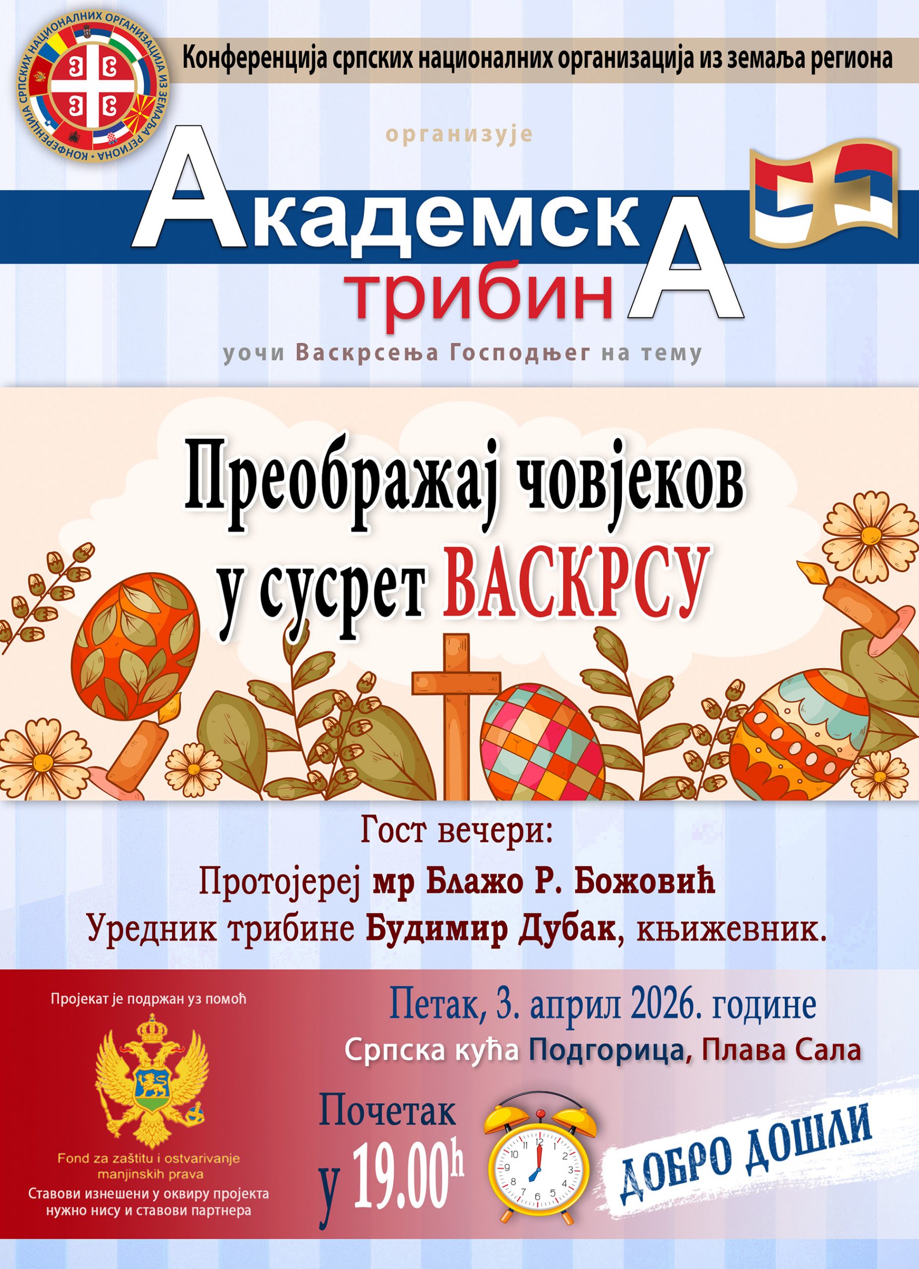 Конферениција српских националних организација из земаља региона уочи Васкрсења Господњег организује Академску трибину на тему „Преображај човјеков у сусрет Васкрсу“ која ће се одржати у Плавој сали Српске куће у Подгорици у петак, 3. априла са почетком у 19:00 часова.