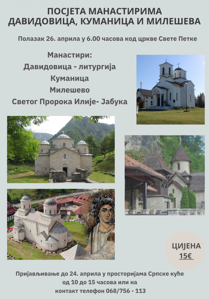 У организацији Српског културног центра „Патријарх Варнава“, 26. априла (у недјељу), организује се посјета манастирима Давидовица, Куманица, Милешева и манастиру Светог пророка Илије на Јабуци.