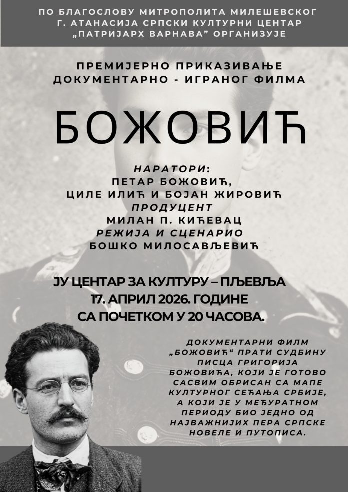 Са благословом Његовог високопреосвештенства, митрополита милешевског Атанасија, у организацији Српског културног центра „Патријарх Варнава“, у Центру за културу Пљевља, 17. априла са почетком у 20 часова, премијерно ће бити приказан документарно-играни филм „Божовић“.