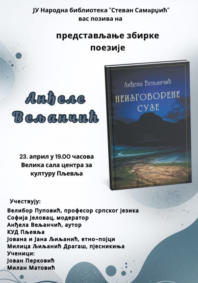 Вечерас, са почетком у 19 часова, у Центру за културу биће одржано књижевно вече на којем ће бити представљена збирка пјесама „Неизговорене сузе“, ауторке Анђеле Вељанчић.