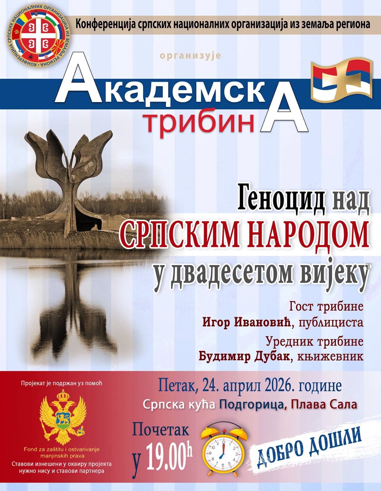 Конферениција српских националних организација из земаља региона организује Академску трибину на тему „ГЕНОЦИД НАД СРПСКИМ НАРОДОМ У ДВАДЕСЕТОМ ВИЈЕКУ“. Трибина ће се одржати у Плавој сали Српске куће у Подгорициу петак, 24. априла са почетком у 19:00 часова. Гост трибине – Игор Ивановић, публициста, Уредник трибине – Будимир Дубак, књижевник.