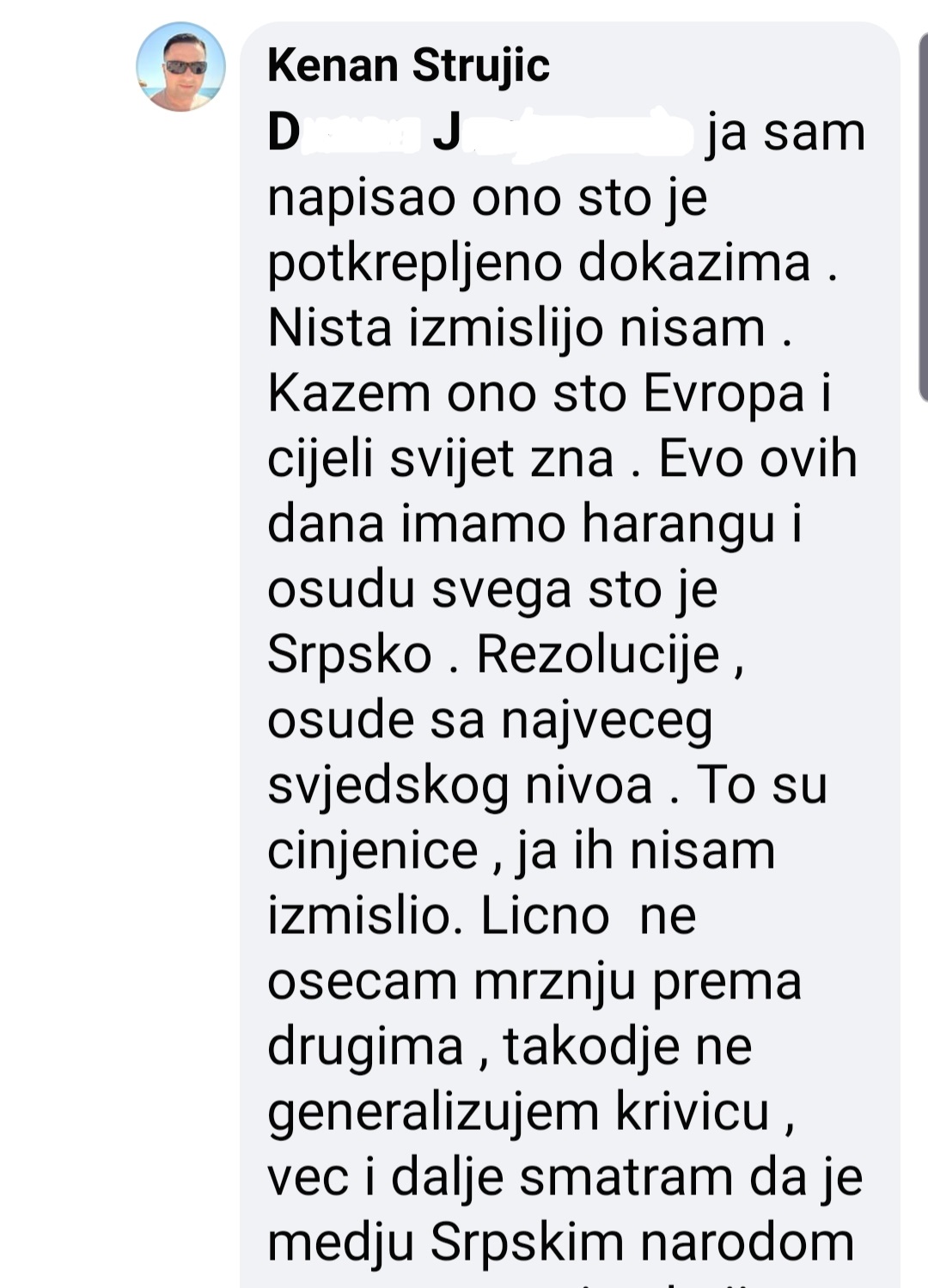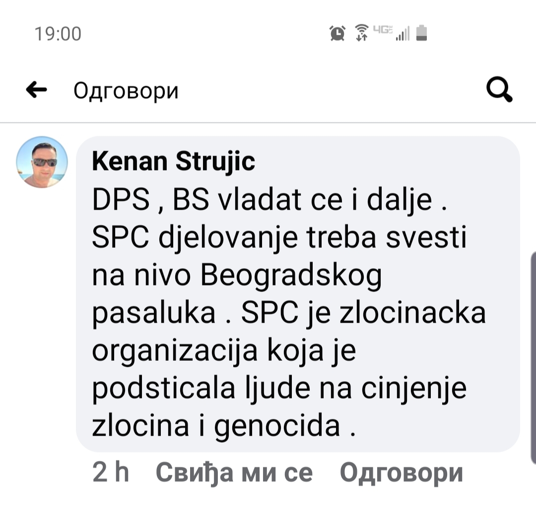 У свега неколико објава на Фејсбуку, заправо коментара на објаве на другим фејбук профилима, Кенан Струјић, брат предсједнице Општинског одбора Бошњачке странке у Пљевљима, а према сопственој тврдњи члан Бошњачке странке и Свјетског бошњачког конгреса, изнио је својеврсну политичку платформу ове Партије пред предстојеће изборе, која више личи на неконтролисани излив мржње и крајње шовинистичких квалификација и оптужби на рачун Српске православне цркве.